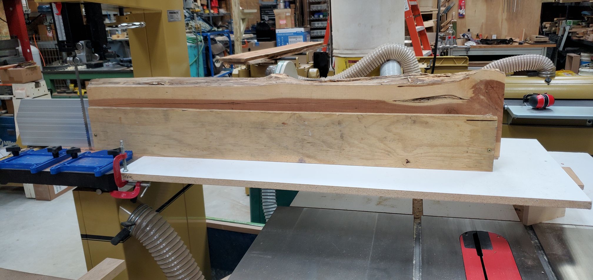 04:17 PM roycroft: jt-woodshop: use some double-stick tape and fasten a straigt board a the bottom of the live edge board and use that to guide it through the bandsaw